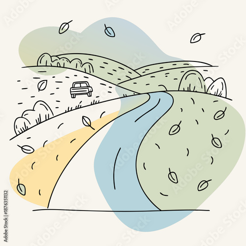 © Isabella, Fototapeta premium Autumn Leaf-Covered Road with Pickup Truck