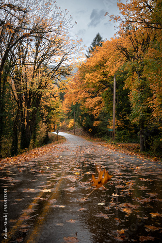 © DGC, Obraz premium Autumn leaf falling onto a road lined with the trees of the Olympic Forest, bearing colorful fall leaves, on a cloudy, rainy day