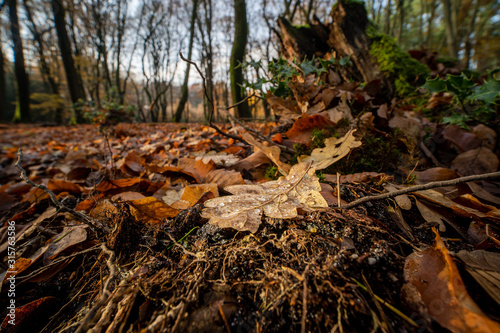 © fotografiecor, Obraz premium Autumn leaf of oak tree lying on the forest ground with water drops on top