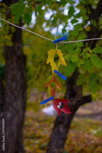 © Дарья Чернова, Naklejka premium autumn leaf with a heart hanging on a rope. High quality photo