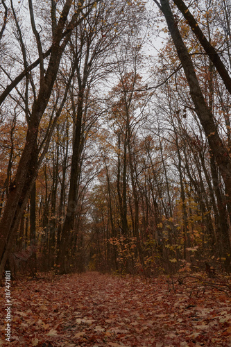 Fototapeta premium Autumn leafy path through the oak grove