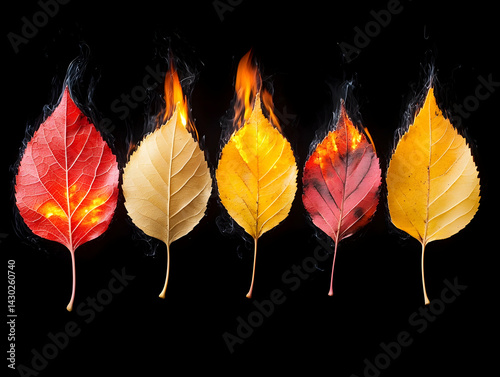 © adityan, Fototapeta premium Autumn leaves ablaze vivid hues against darkness creating a surreal fiery display of seasonal change