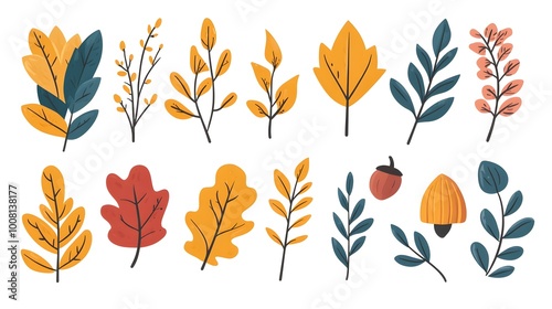 Fototapeta premium Autumn leaves, acorns, and evergreen branches vector illustration on a white background. Flat cartoon design of fall season elements for a greeting card or decoration.