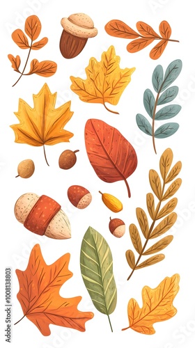 © Vendula, Fototapeta premium Autumn leaves, acorns, and evergreen branches vector illustration on a white background. Flat cartoon design of fall season elements for a greeting card or decoration.