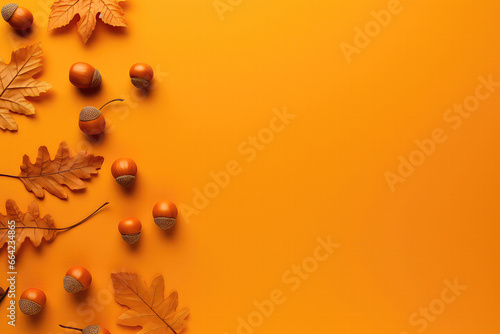 © Anastasiia, Fototapeta premium Autumn Leaves And Acorns Adorn An Orange Background, Evoking Thanksgiving Vibes