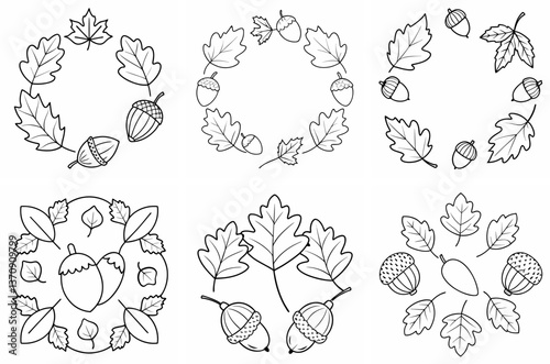 © MAHMUDA , Naklejka premium Autumn Leaves and Acorns Frame Outline Coloring Page Line Art Drawing