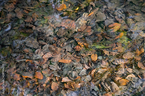 © Alison, Obraz premium Autumn leaves and beech nuts lying on a riverbed seen through the clear water