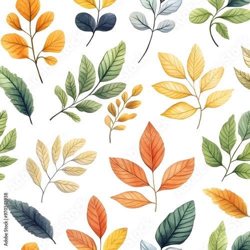 © LookChin AI, Fototapeta premium Autumn Leaves and Fresh Foliage Seamless Pattern on White Background