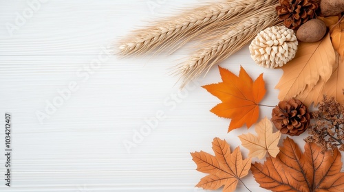 © Yulia, Fototapeta premium Autumn leaves and pinecones on white wooden background
