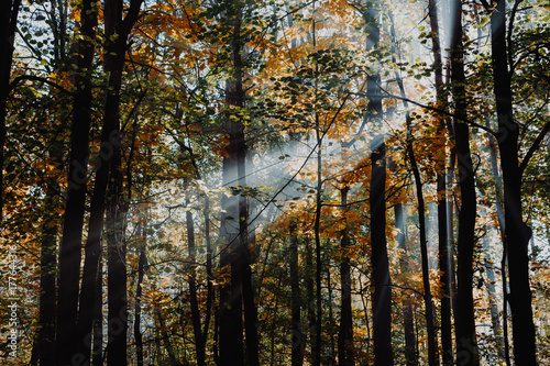 Fototapeta premium Autumn leaves background in selective focus. Red, orange and yellow dry leaves.