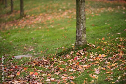 © vectorfusionart, Fototapeta premium Autumn leaves by tree trunk on field