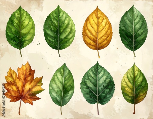 © Dea, Obraz premium Autumn Leaves Collection - A Watercolor Illustration of Seasonal Foliage.