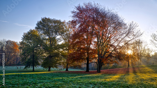 © Elton, Fototapeta premium Autumn leaves colour with sun rays through the maple trees on a foggy morning