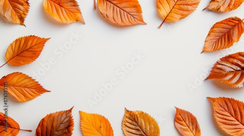 Obraz premium Autumn leaves creating a natural frame on a plain white background, high detail, vibrant colors, high resolution, focus cover all object, deep dept of field