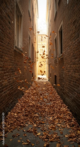 © Merah, Fototapeta premium Autumn leaves fall in a narrow alleyway between aged brick buildings