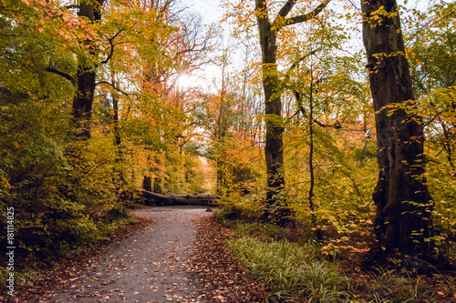 Obraz premium Autumn leaves fallen on walking trail in Salcey forest on cloudy day -...
