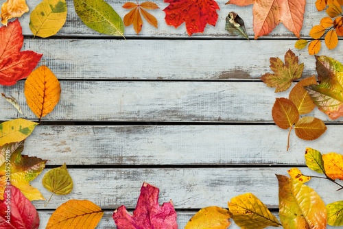 © vectorfusionart, Fototapeta premium Autumn leaves fallen on wooden background