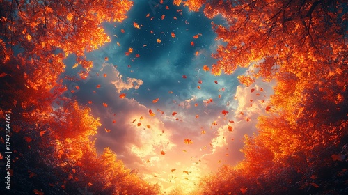 © Fridocha, Fototapeta premium Autumn leaves falling from forest canopy at sunset