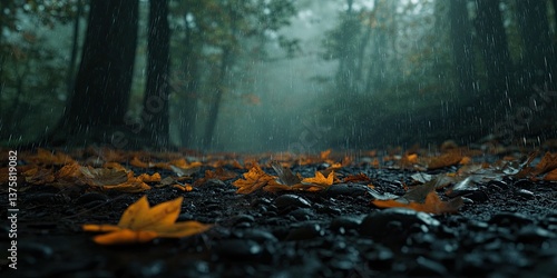 © DnQajik, Obraz premium Autumn leaves falling on the forest floor, a beautiful autumn nature background