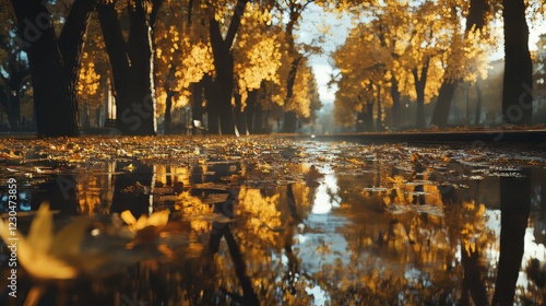 Obraz premium Autumn Leaves Floating in a Puddle Reflecting Trees