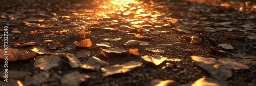 Obraz premium Autumn Leaves Ground Sunlight Golden Brown Nature Path fall view soil warm glow rays mood image