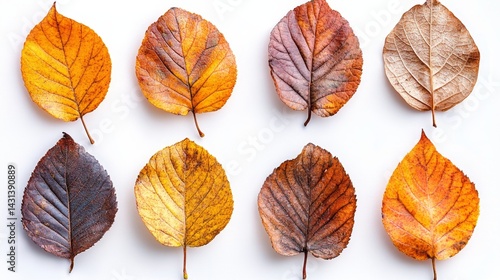 © taezhniya31, Obraz premium Autumn leaves in various colors arranged in grid pattern on white background.