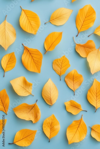© ArtCookStudio, Obraz premium Autumn leaves of various shapes and colors scattered on a bright blue background