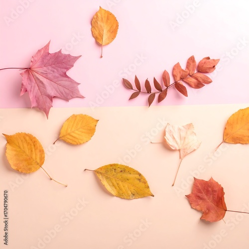 © Sandi, Obraz premium Autumn leaves on pastel background
