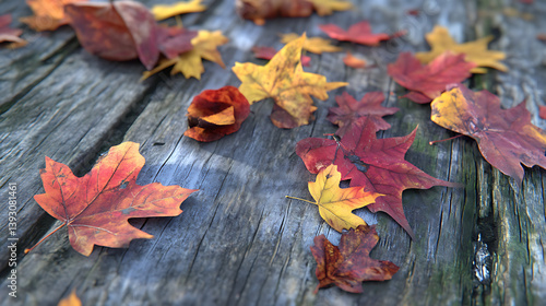 Obraz premium Autumn leaves on weathered wooden planks (2)