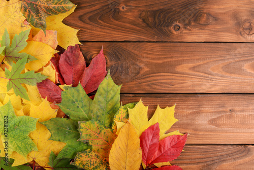 © azure, Obraz premium Autumn leaves over wooden background with copy space
