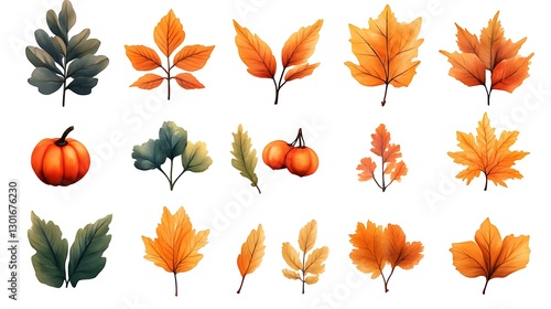 Fototapeta premium Autumn leaves, pumpkins floating on white