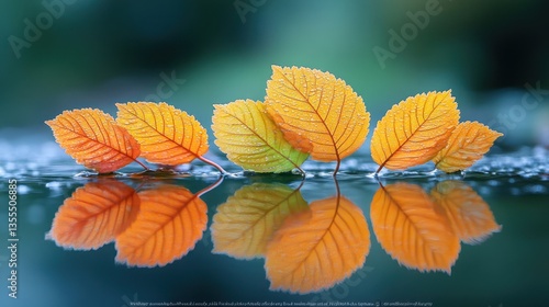 © rasya, Obraz premium Autumn leaves reflected in water on a blurred background