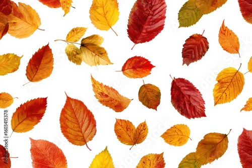 © Helpi, Obraz premium Autumn leaves scattered on a white background for seasonal design use