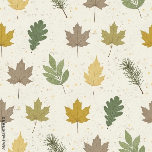 © ZHMPRO, Fototapeta premium Autumn leaves seamless pattern featuring maple, oak, and pine leaves in various shades of green, yellow, and brown on a beige background
