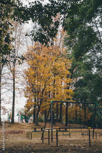© Luica_MPM, Naklejka premium Autumn leaves seen through the swing