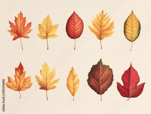 Fototapeta premium Autumn Leaves Showcase Vibrant Fall Colors and Textures with Botanical Illustration Theme.