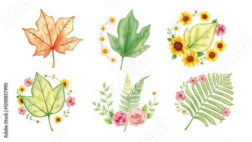 © Ahingska, Obraz premium Autumn Leaves Sunflowers Roses Fern Floral Wreath Watercolor Botanical Illustration