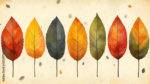 © MASJAB, Fototapeta premium Autumn Leaves Watercolor Row.