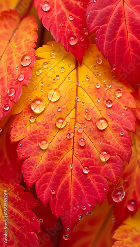 © StockVisionary2024, Fototapeta premium Autumn leaves with water droplets image