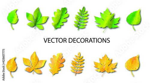 Obraz premium Autumn leaves with watercolor texture. Birch, oak, maple, mountain ash, chestnut. Set of vector decorations.
