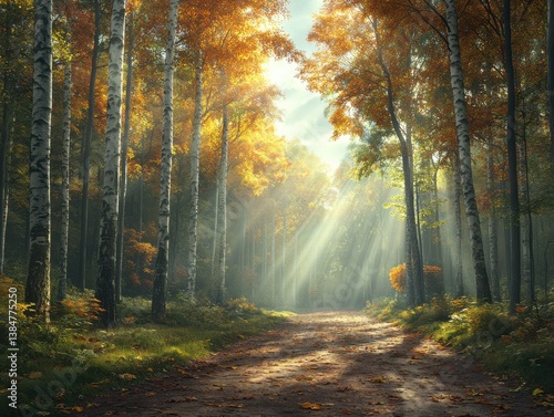 Obraz premium Autumn light shines through trees in a serene forest during a peaceful...