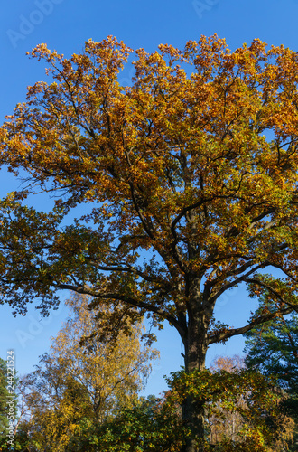 Naklejka premium Autumn. Luxurious crown of oak with yellowed leaves against the blue sky.