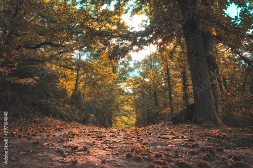 © dhvstockphoto, Obraz premium Autumn magic forest. From the ground, path full of chestnuts, It makes its way through the trees. Hervas, Spain.