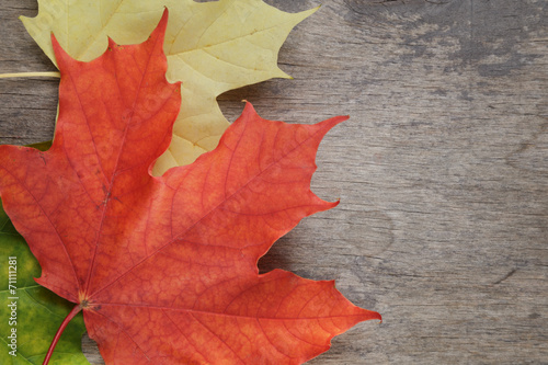 Obraz premium autumn maple leaves on wood table