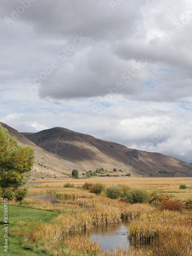 Fototapeta premium Autumn marsh wetlands and rolling hills with sunlight breaking through the clouds