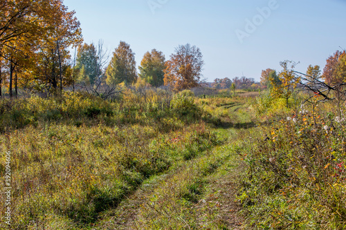 Fototapeta premium autumn meadow on a sunny day, forest in the background