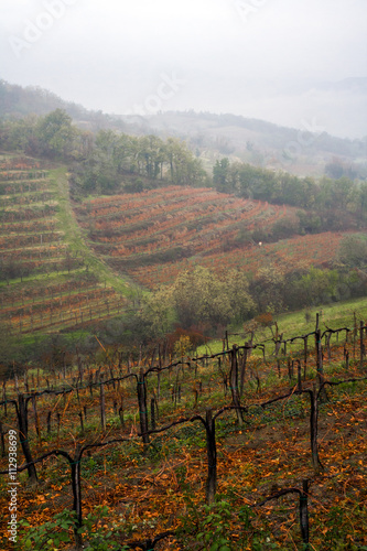 © Sunnyrain, Fototapeta premium Autumn mist in Alpine vineyard