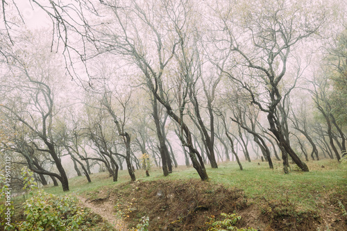 Obraz premium Autumn Misty Deciduous Forest Landscape