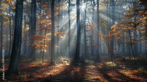 Fototapeta premium Autumn misty forest with light rays