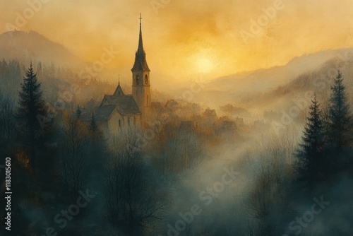 Fototapeta premium Autumn Morning Mist in Serene Rural Landscape with Church Steeple and Foggy...